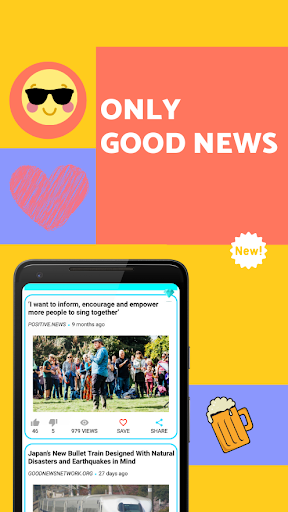 100 trusted global sources. Sign up for your free Only Good News Daily delivered by email every morning. It also has an Instant News feature that presents small bytes of news on your lock screen.