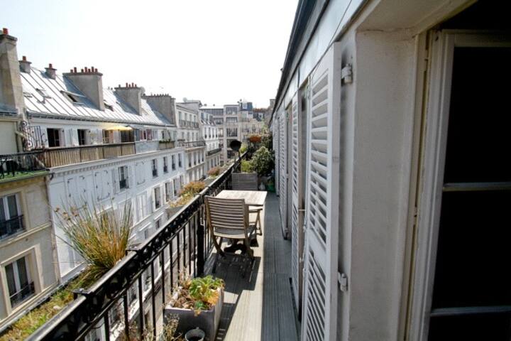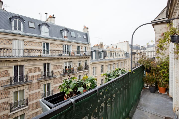 I rent in the heart of Paris on the 5th floor of a charming duplex of 200 m2 a room with a balcony cable TV double bed or two twin beds your choice. Its located in a more residential area away from most of Pariss must-sees but is a short walk from the Metro giving you ample opportunity to explore. The street is quiet in a busy area close to the Grands Boulevards numerous cinemas theaters restaurants pubs.