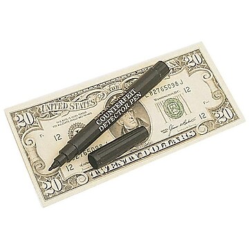 With its simple application and immediate results this Staples counterfeit detector pen is an easy way to protect and verify your cash flow. The iodine-based ink disappears completely on legal paper money but a dark stain remains on fraudulent bills. Staples counterfeit detector pens provide a quick and easy way to verify bills in any cash handling environment.
