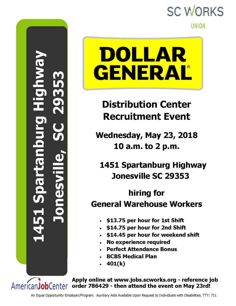 Sc Works On Twitter Dollar General Distribution Center Is Hiring General Warehouse Workers In Spartanburg Next Week Hiring Event Next Wednesday 5 23 10 A M 2 P M See Flyer Job Order 786429